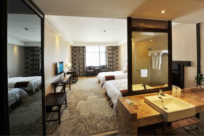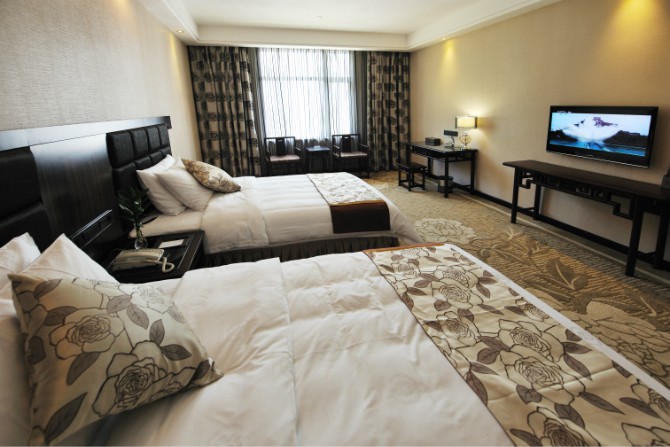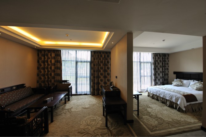 房內(nèi)設(shè)施齊全,使用中央空調(diào),37寸3D液晶電視,客房免費提供不計時國內(nèi)長途電話,免費光纖網(wǎng)絡(luò)接入,紅木家具,保險箱、冰箱。酒店餐廳設(shè)有豪華餐飲包房11間。